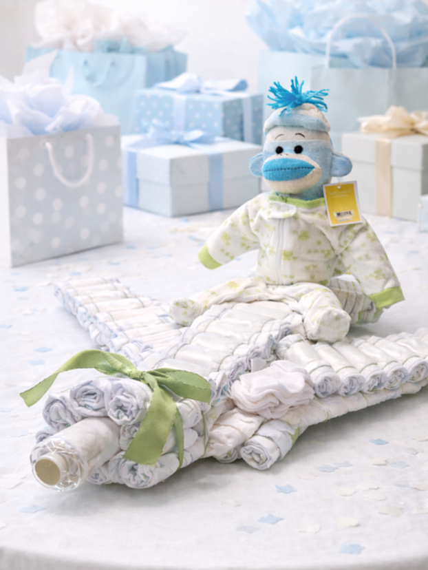 This project requires time and patience, so if you're short of either, consider hiring a professional. Our Diaper Cakes start at around $75 and are completely customizable. Send us an email today to start designing one for your next shower!