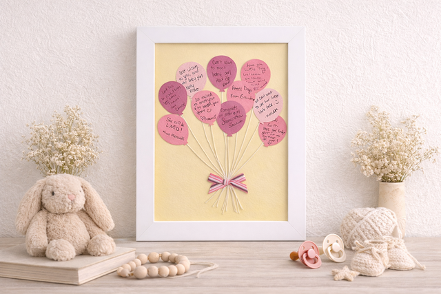 Create a unique baby shower guest book idea that doesn’t end up tucked away in a drawer! This DIY baby shower guest book wall art tutorial shows you how to create a framed keepsake artwork where guests sign and decorate individual balloons, forming a charming balloon bouquet design. The finished piece becomes meaningful nursery wall art and a lasting reminder of everyone who celebrated the mom-to-be. Perfect for anyone searching for creative baby shower guest book alternatives, baby shower keepsake ideas, or interactive baby shower activities that double as home decor.