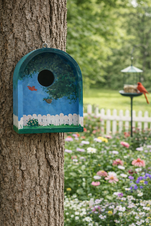 I painted the birdhouse with the trees and Cardinal on it, as well as the purple house with the butterflies and flowers, for my mother and stepfather. They live in Michigan and are surrounded by the most beautiful trees at their house! Cardinals also stop by from time to time (which I do not get to see in Washington) so I wanted to be sure to put one of those on there too.