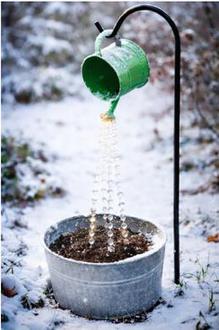 When the crystals are dry, attach them through the holes of the watering can with the craft wire. You definitely want to make sure you use a copper wire for this step. It will keep your art bright and shinny, not dingy and rusty. A spool of Artistic Wire's Non Tarnish Silver Plated is a good investment and will get you through this project a couple times over if your use it sparingly. To adhere the crystal garlands, make a "U" shape with the copper wire, and carefully feed it into a watering hole and out another. Twist the wire ends together to form a circle. Feed the metal loop on the end of a garland stand onto this loop. Repeat with the remaining strands of crystal garland.